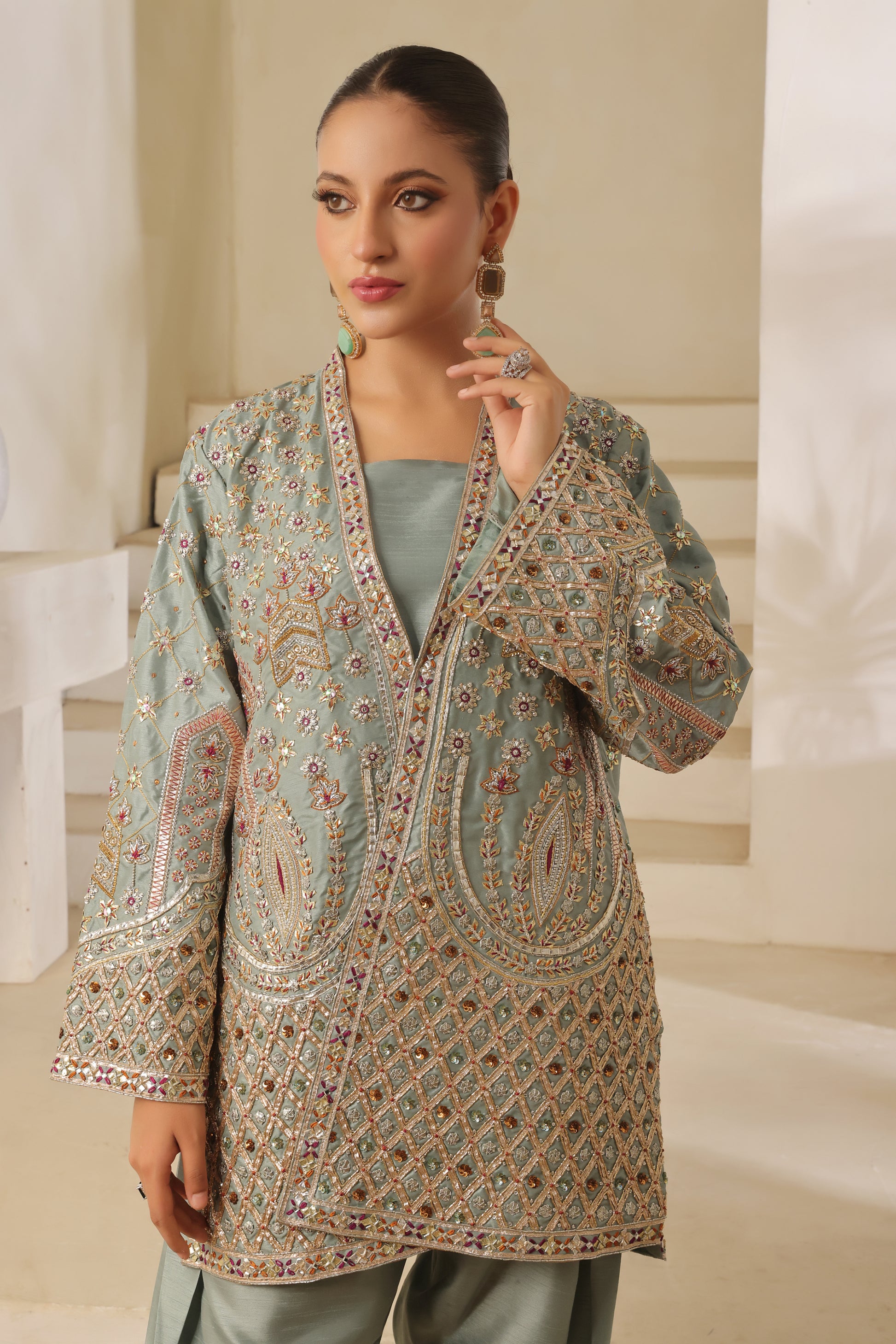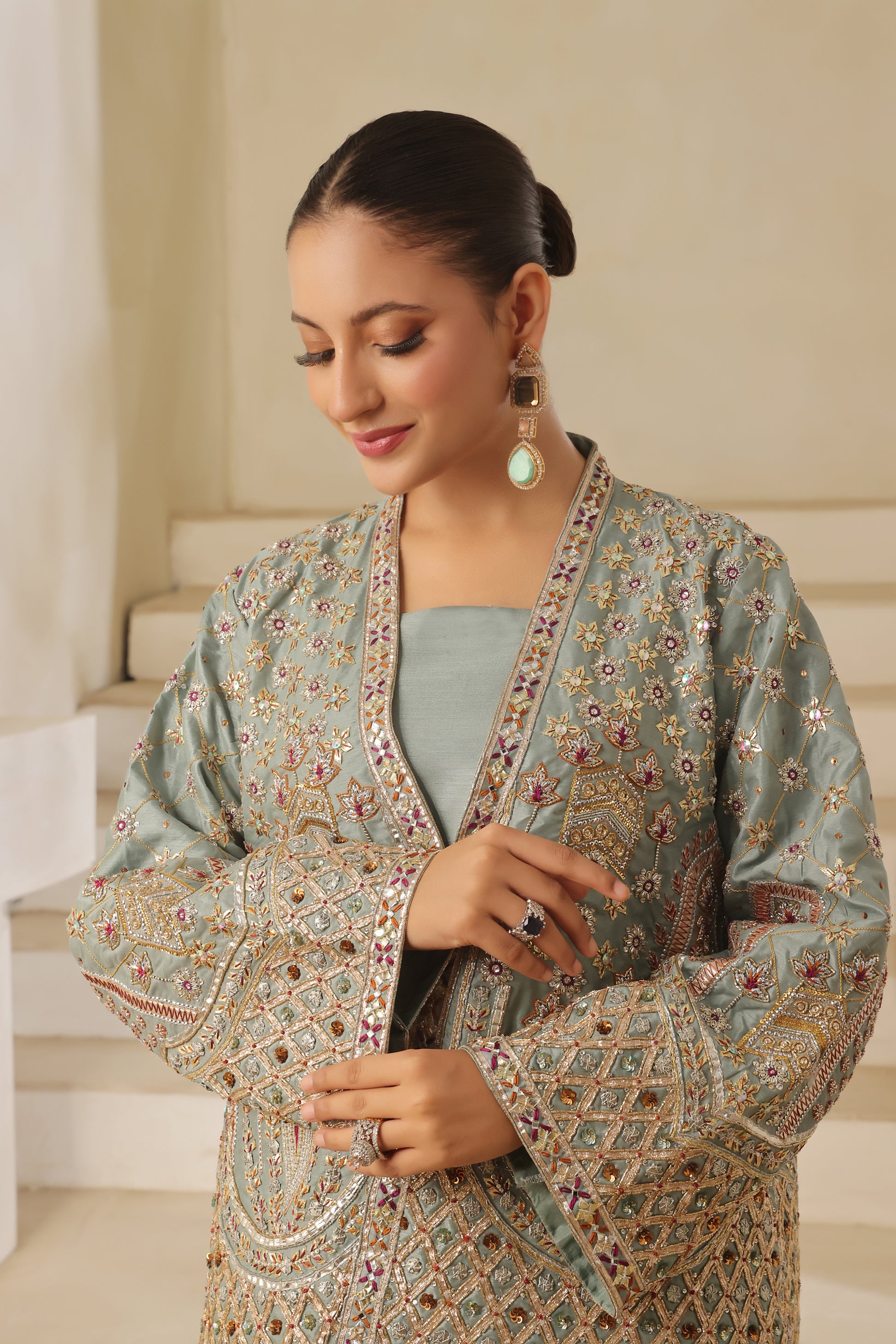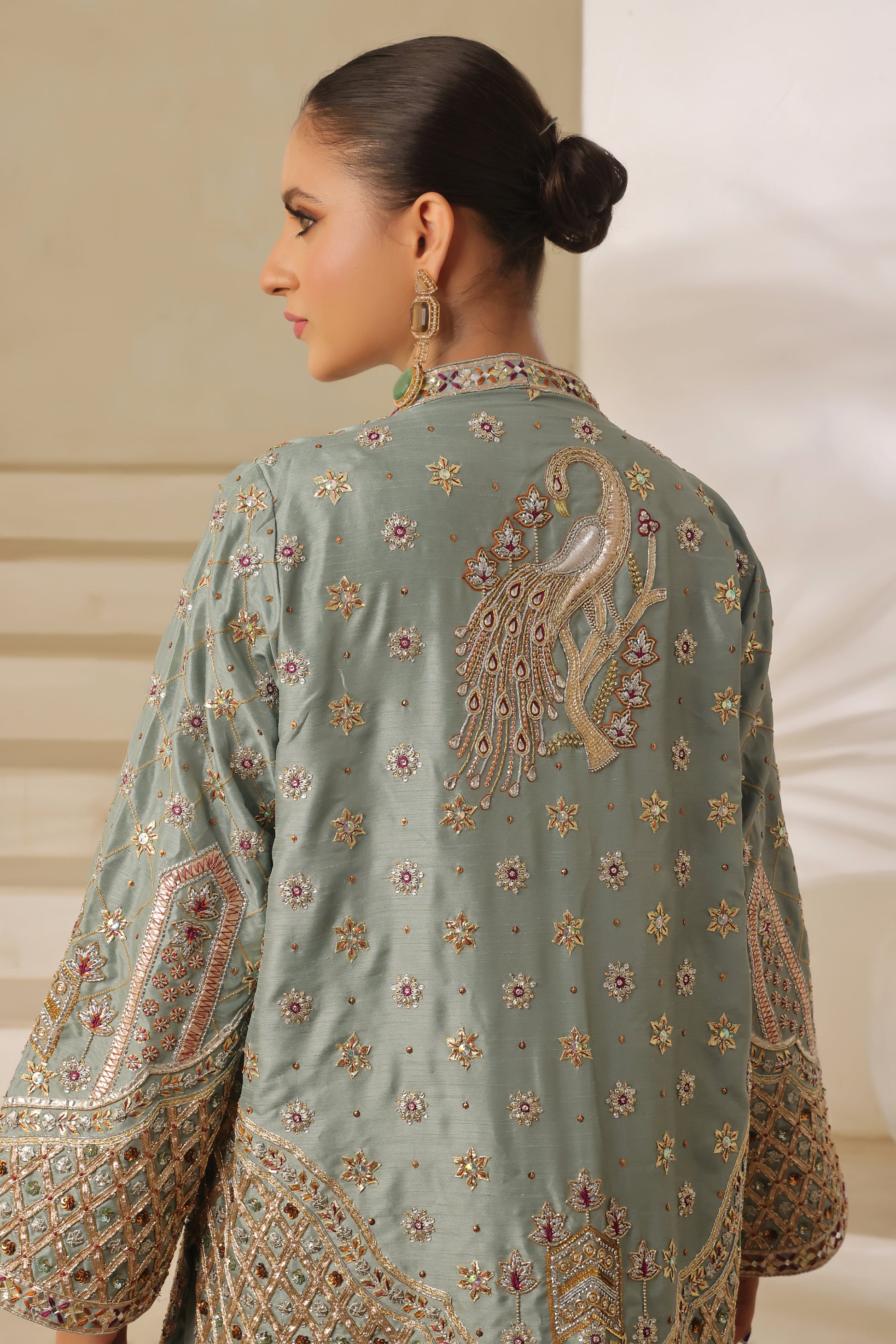 A refreshing take on our signature design, crafted on sage green Chinese raw silk. The overlapping jacket, adorned with intricate hand embroidery in gota, zardozi, sitara, and resham, radiates understated elegance. It’s paired with a classic khari shalwar, adding a graceful traditional touch to this contemporary silhouette.