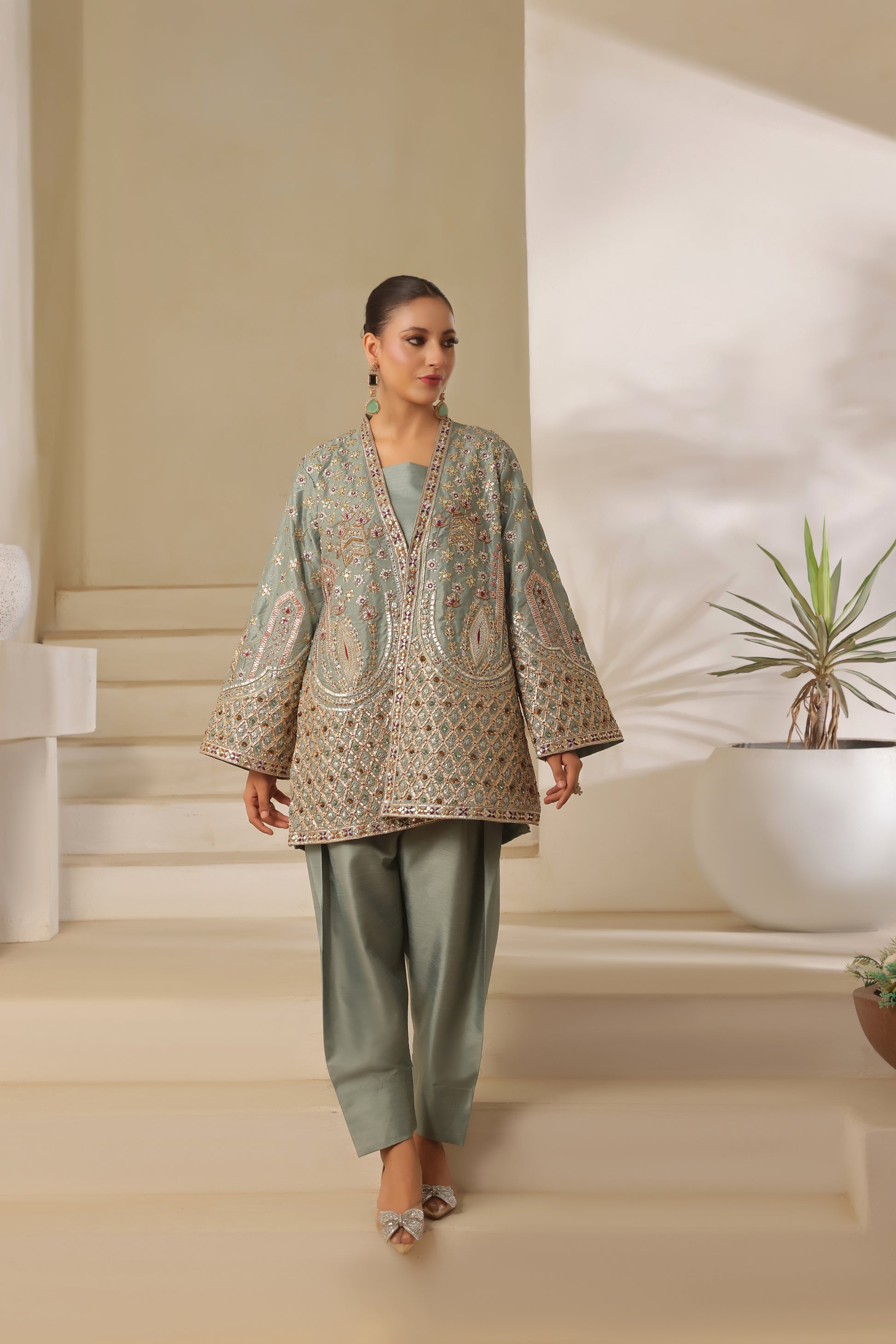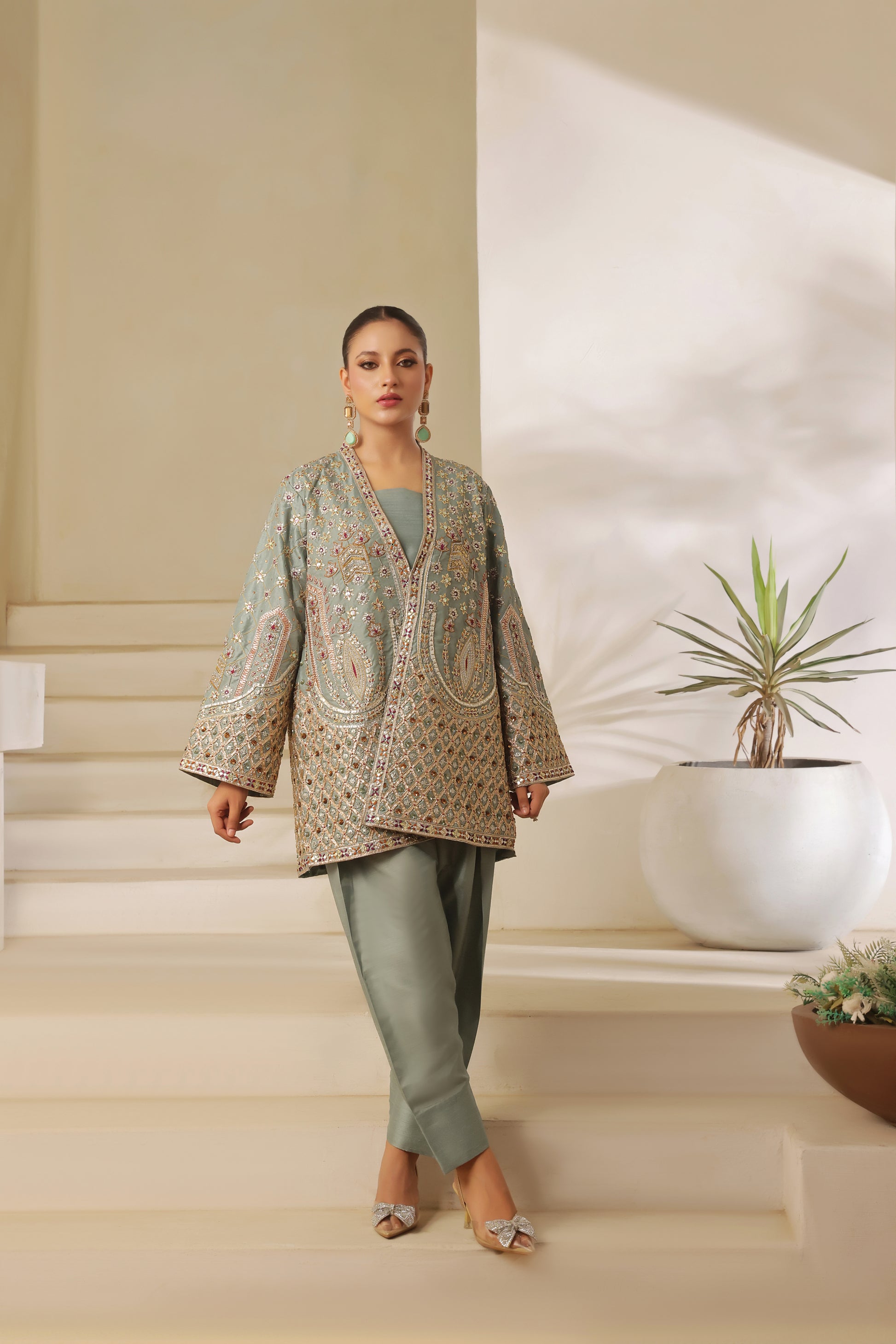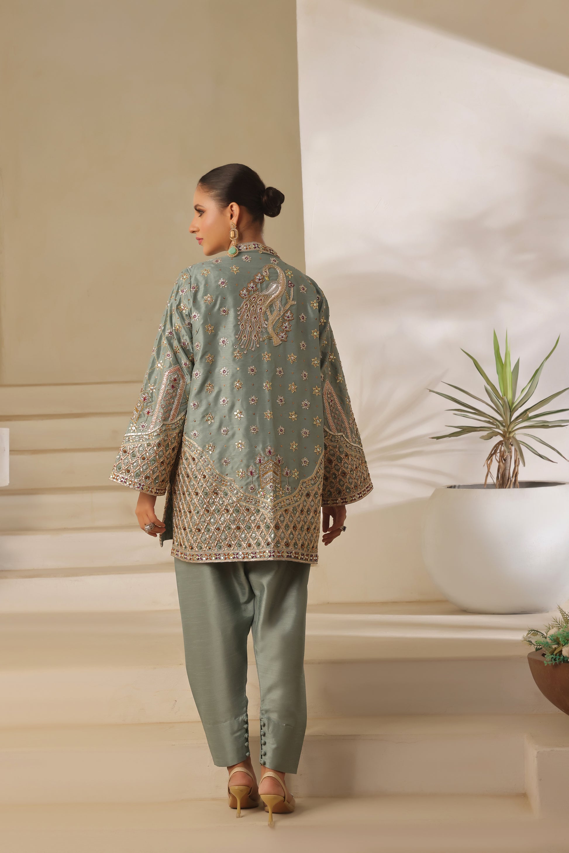 A refreshing take on our signature design, crafted on sage green Chinese raw silk. The overlapping jacket, adorned with intricate hand embroidery in gota, zardozi, sitara, and resham, radiates understated elegance. It’s paired with a classic khari shalwar, adding a graceful traditional touch to this contemporary silhouette.