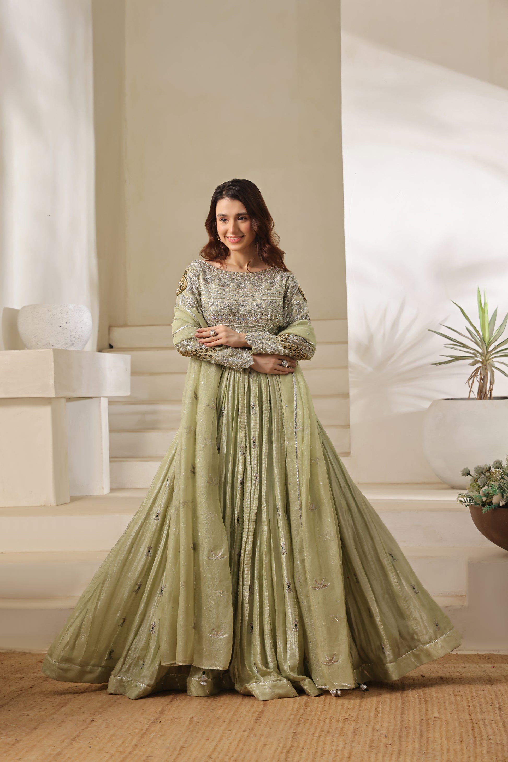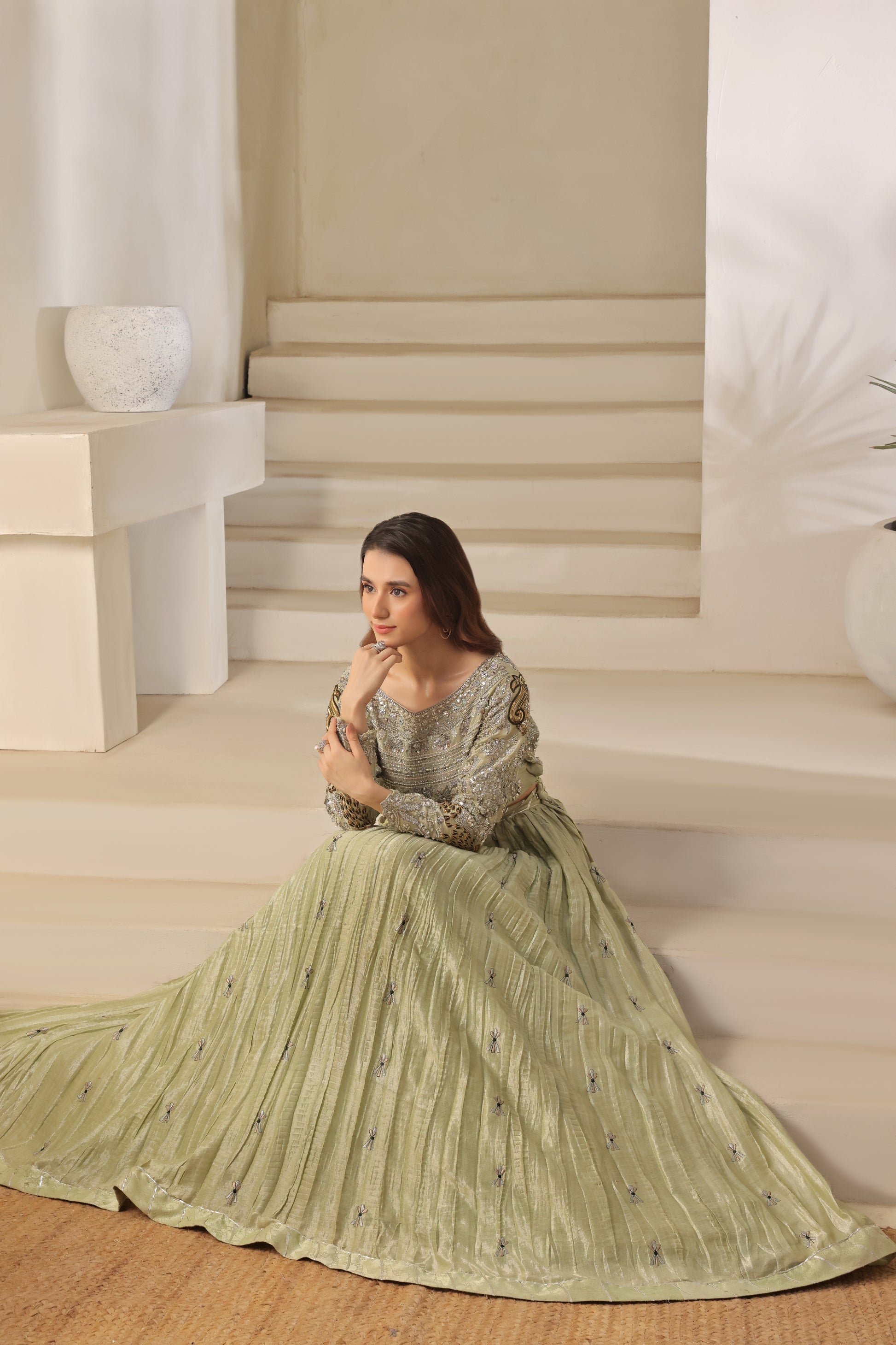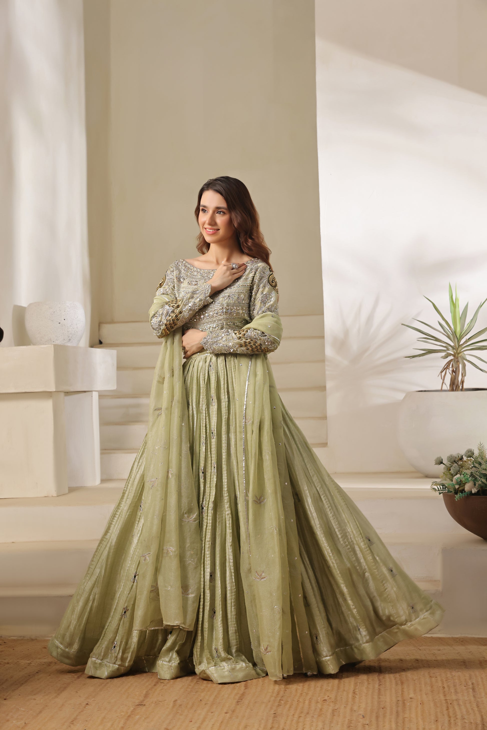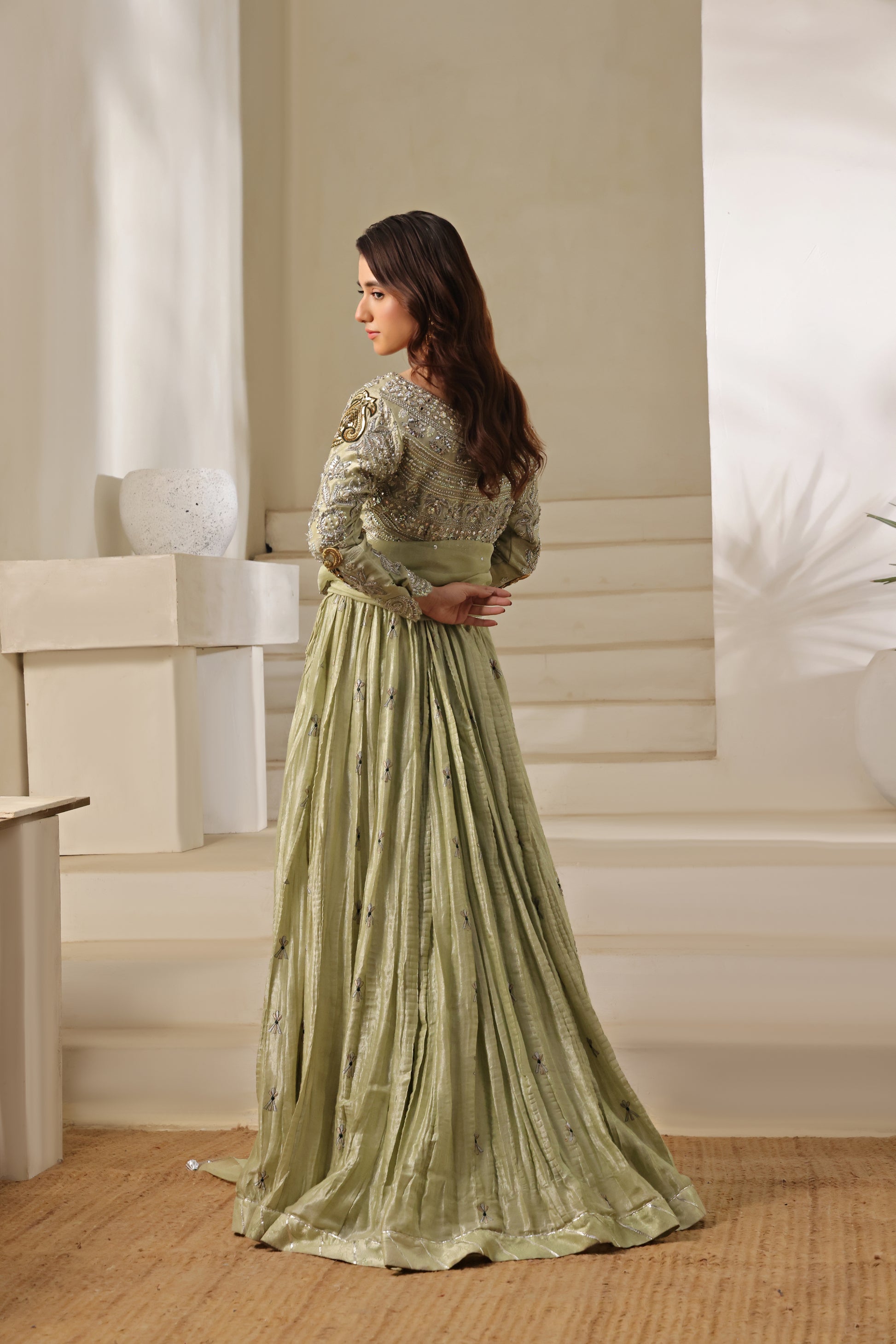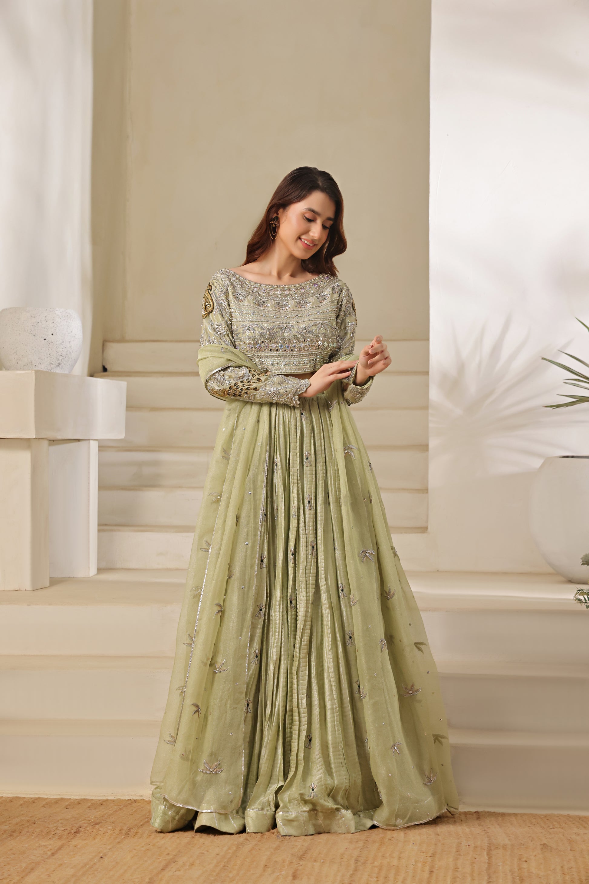 A stunning pistachio ensemble that perfectly balances elegance and opulence. The choli, richly adorned with shisha, pearl, polki, and mirror work, exudes intricate artistry and timeless charm. It’s paired with a slightly crushed lehenga featuring delicate all-over thread work, and a zari net dupatta embellished with graceful motifs — a vision of effortless sophistication and festive allure.