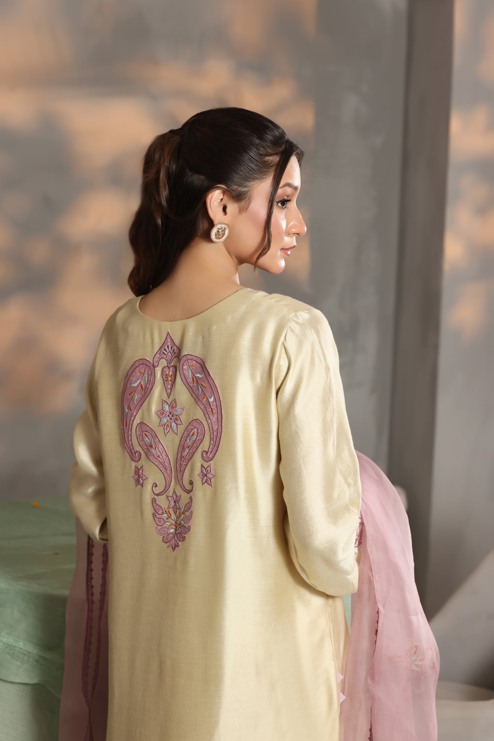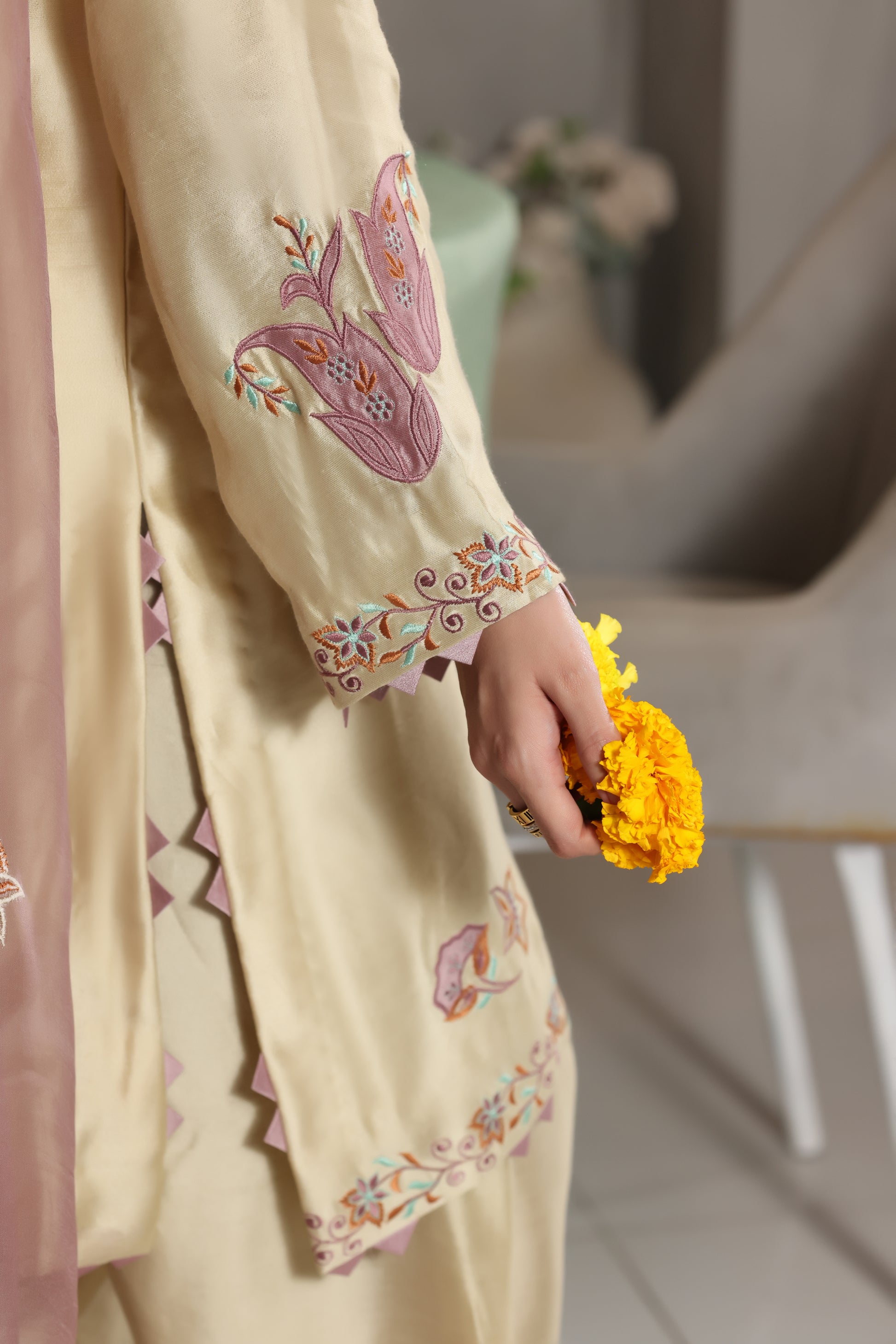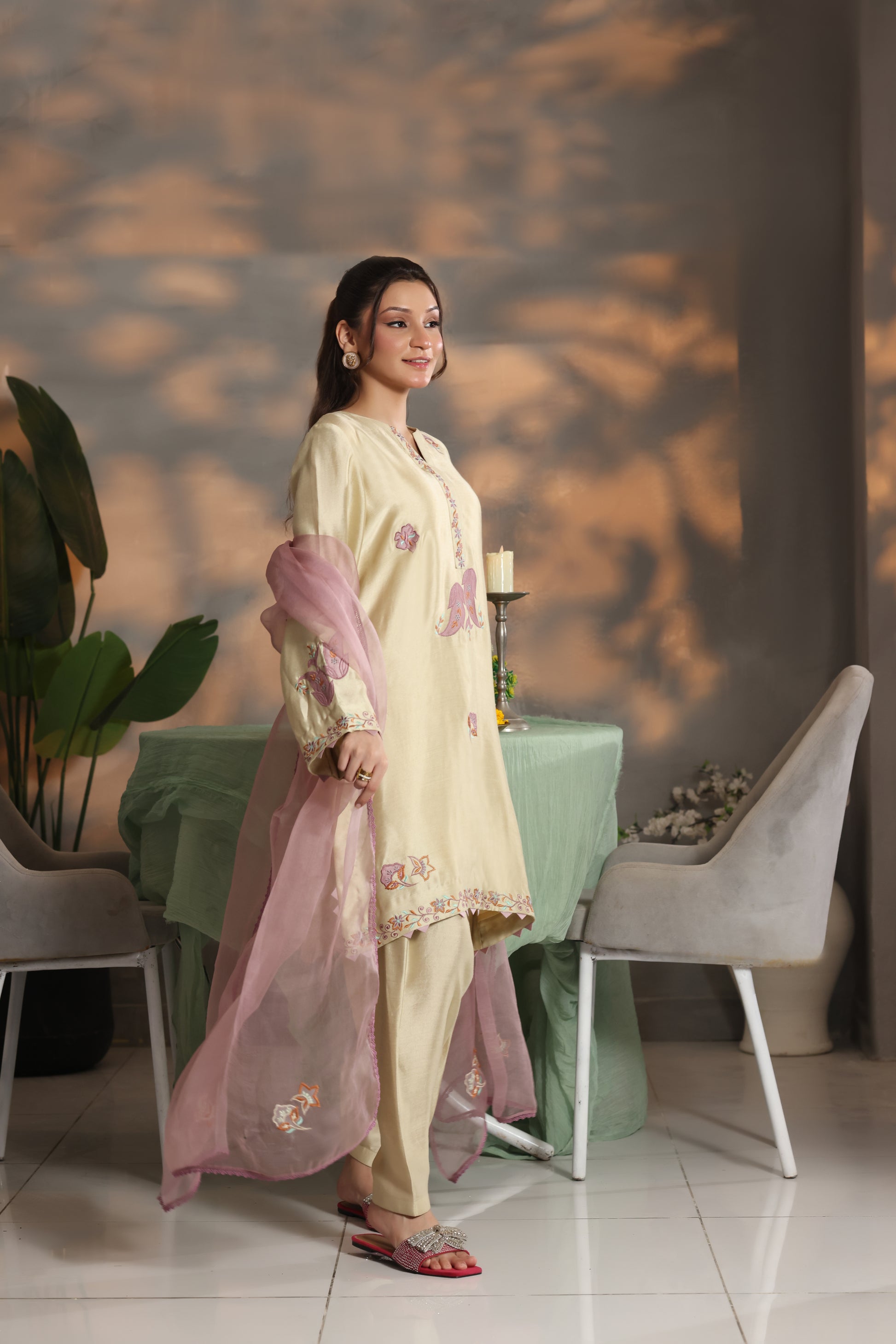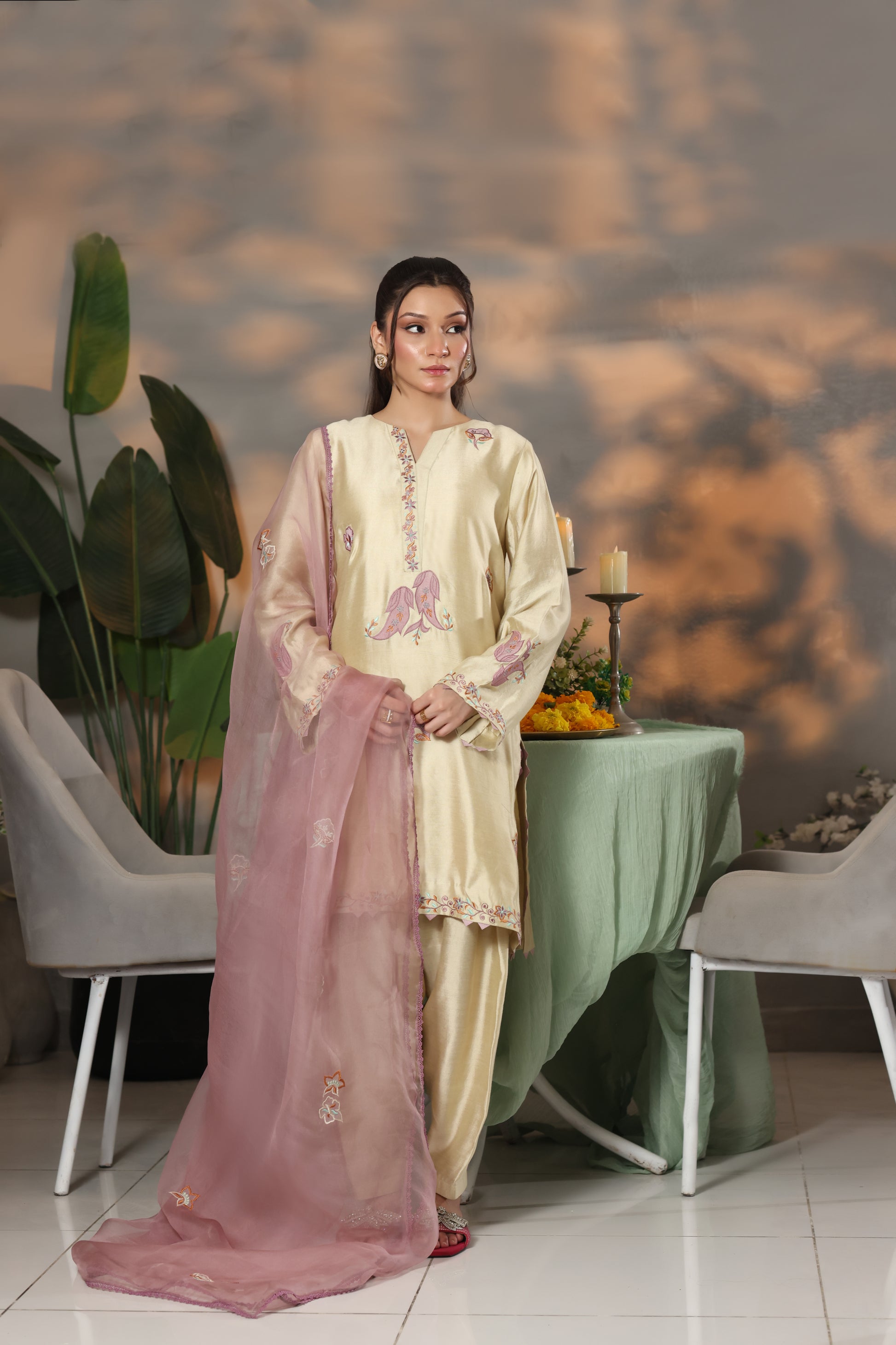 A soft matte silk short shirt featuring delicate purple appliqué and fine threadwork, paired with a classic khari shalwar. Finished with a sheer organza dupatta adorned with subtle embroidered motifs.